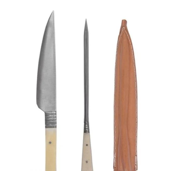 Dette sæt er lavet af Rustfrit Stål. Den fås med et træ, ben eller horn håndtag. Kniven og spise pick er 19 cm lang. Sættet leveres med en læderpung.