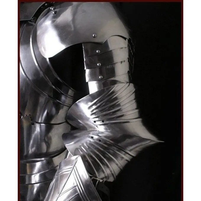 Det har rundinger bag på knæene for at sikre, at også disse åbne pletter er beskyttet. Rustningen er helt bærbar og er lavet af 1,2 mm tykt stål. Den vejer 37,8 kg og længden er 1,80 m.