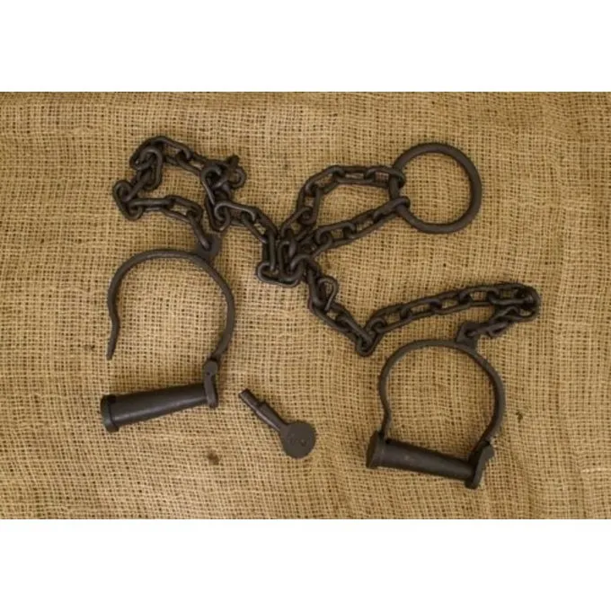 Disse historiske fod manchetter er helt funktionelle og lavet af holdbart stål. De blev brugt fra det 16. til langt i det 20. århundrede. Den indre diameter er ca.. 8 cm, vejer 1,2 kg og den samlede længde af manchetter og kæder er 134 cm.