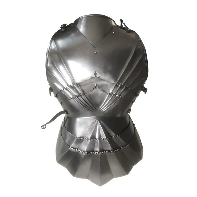 Denne smukke kyrads med matchende bagplade er lavet i den smukke stil af tyske gotiske (15.-16. århundrede). Den rustning er rigt dekoreret med gotiske mønstre, der svarer til dekorationer i manuskripter og parallelle kamme, der styrker stålet og samtidig ser meget elegant. Armeringen er 1,2 mm tyk, så det ikke er egnet til reenactment slag. Du kan bære den som en dragt, under larp kampe eller bruge det som dekoration. Du kan derefter kombinere det som ønsket med en hjelm og ben rustning efter eget valg til at skabe en fuld rustning. Selen består af forskellige plader og er meget fleksibel og let at bære. Du kan justere den til størrelse med læderremme.