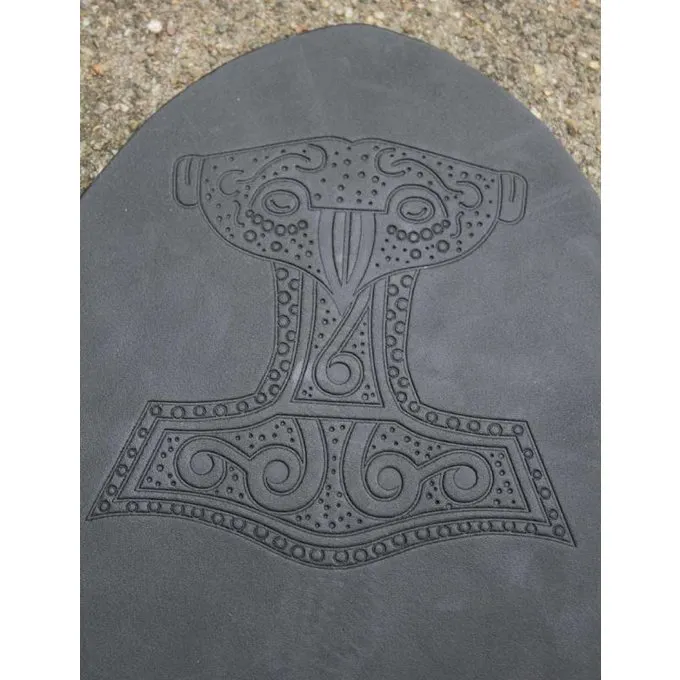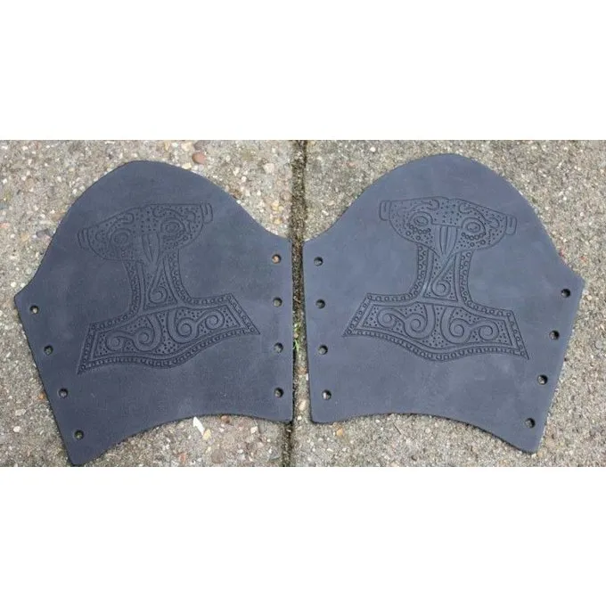 Disse armskinner beskytte hele underarmen, og de er lavet af koskind. Den Torshammer motiv fra Schonen (Sverige) er afbildet i læderet. Den armskinner kan fastgøres med 3 mm tykke læder snore. De er 3 mm tyk, deres længde er 20,1 cm, og deres øvre diameter er 21 cm, deres lavere diameter er 16,5 cm.
