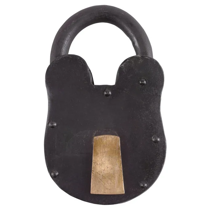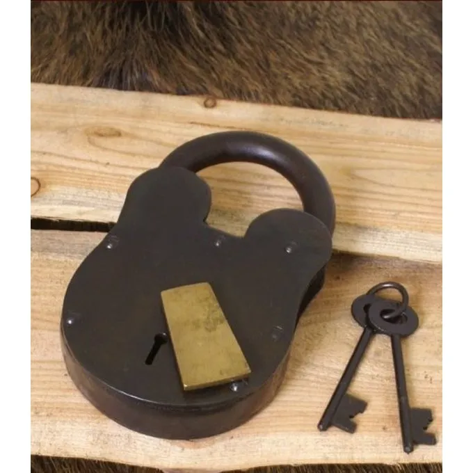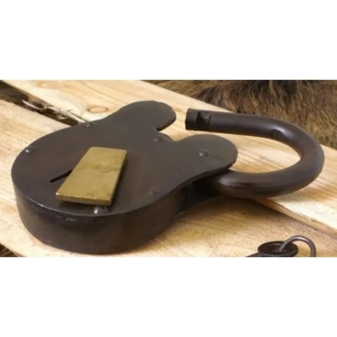 Denne ekstra store hængelås har et håndgjort traditionelle udseende. Det er lavet af stål og har to taster og en kobberplade dækker nøglehullet. Denne lås er 23 cm lang og 14 cm bred. Den vejer 0,5 kg.