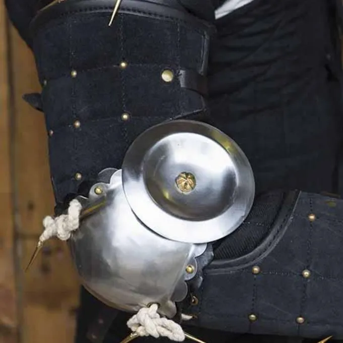 Disse armværn er inspireret af originaler fra det femtende og sekstende århundrede. De består af en stål albue copwith en roundel og læder vagter for den nedre og øvre arm. Den rustning har en meget luksuriøse og klassiske look! Den albue betjent har en flosset stål kant dekoreret med farvet læder. Læderet del af armen vagt er lavet af ruskind og har det luksuriøse udseende fløjl, dette også smukt dekoreret med messing nitter. Denne rustning sagtens kan kombineres med for eksempel til en Brigandine, dublet eller andre panser stykker fuldføre din 15.-16. århundrede kostume. Rustning består af tre overlappende dele, der giver optimal bevægelsesfrihed. Du kan fastgøre panser sikkert til din arm med læderremme. Delene kan derfor også fjernes og anvendes individuelt. Den albue betjent har snørebånd til at fastgøre det sikkert til læder armværn, men du kan også kombinere dem med andre panser efter eget valg.