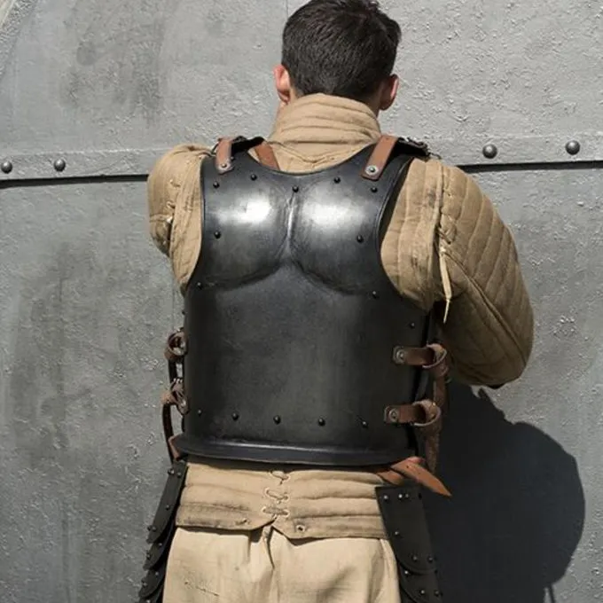 Denne backplate er baseret på historiske originaler fra middelalderen. Med den patinerede overflade giver det dit kostume et særligt twist! Bagpladen er udstyret med nitter til ekstra styrke og beskytter ryggen mod hofterne. Det kan kombineres med næsten alle patinerede brystplader fra Epic Armory. En fin detalje er formen på overkroppen, hvor den efterligner musklerne i overkroppen. Du kan komfortabelt bære og fastgøre bagpladen med læderremmen, du kan også justere slidmetoden med disse stropper. Denne rustning er 1 mm tyk og passer til LARP kampe, kostumer og Cosplay.
