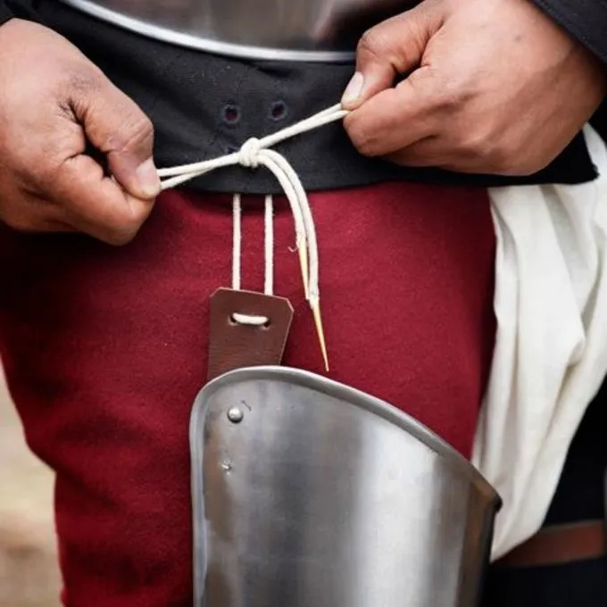 Denne benrustning er baseret på originaler fra det 15. århundrede. Originaler kan ses i for eksempel Royal Armories i Leeds og i italienske malerier fra det 15. århundrede. En lignende benpansel er for eksempel afbildet i Montefeltro altertavlen af Piero della Francesca, hvor de bæres af den knælende condottiere Federido da Montefeltro. Den malede benrustning var bare lidt mere luksuriøs. Denne replika benrustning beskytter overbenet, underbenet og knæene. Stærke læderremme bagpå rustningen gør det muligt at fastgøre det sikkert. Toppen har hvide snørebånd til fastgørelse til dit bælte, gambeson eller brystplade. Benpanser kan derfor bæres behageligt i timer og forbliver fastgjort. Bagsiden af knæet er godt beskyttet af de autentiske historiske runde. Denne rustning kan kombineres med andre rustningstykker og er perfekt til sene middelalderlige kostumer.