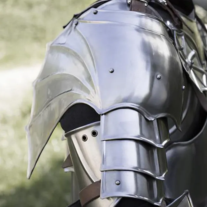 Dette sæt er lavet efter original rustning fra den gotiske æra på blyindfattede ruder, i håndskrifter og på museer. Denne stil er kendt i arkitektur for sin dramatiske og skarpe former, blev dette afspejles også i rustning fra denne periode. Dette sæt består af en Gorget (todelt) og et sæt pauldrons. Den Gorget peger og har to gotisk stil roundels for ekstra beskyttelse af armhulerne mod pile og lignende. Den Gorget dækker halsen og nakken. De pauldrons og Gorget er forbundet med hinanden med høj kvalitet læder bælter. De pauldrons beskytte skuldre og overarme. På bagsiden det færdige i en ribbet og spids form, hvilket er noget der minder om en drage fløj! Du kan fastgøre pauldrons til overarmen med læderremme. </ P> Denne rustning er 1 mm tyk og egnet til Larp slag, Cosplay og teater.