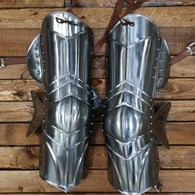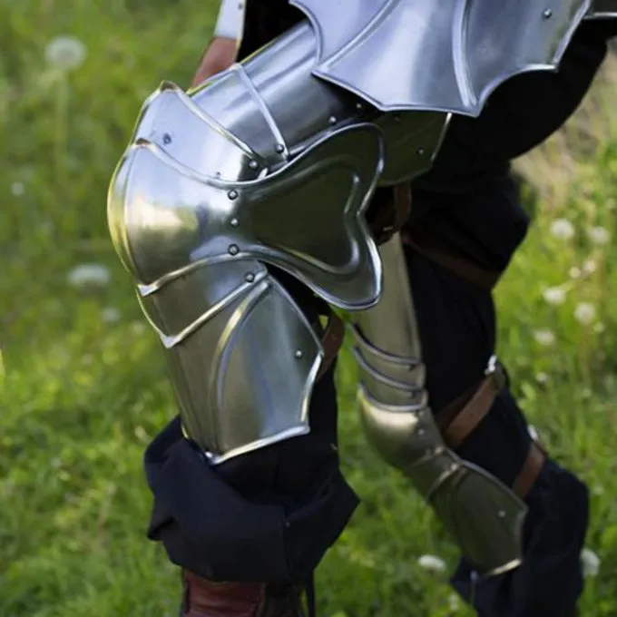 Disse cuisses er baseret på historiske originaler fra den gotiske periode. Denne periode havde en meget dramatisk kunst stil, der var kendetegnet ved dramatiske, udtryksfulde og vinkelformede mønstre. Denne gotisk stil afspejles tydeligt i det visuelle udseende af disse cuisses. Den rustning beskytter de øverste ben, lår, knæ og en del af den nedre ben. Armeringen er meget bevægelig og består af overlappende stålplader. De cuisses kan fastgøres meget fast med læderremme bag lår, knæ og underben, og du kan også fastgøre det øverst til dit bælte, så det absolut ikke kan falde af. Det er let at kombinere med andre plade rustning såsom tassets og en chestplate. Denne rustning er 1 mm tyk og er egnet til larp slag, kostumer og Cosplay.