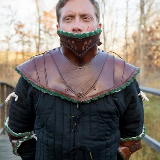 Dette læder bevor er baseret på middelalderlig plade rustning. Denne bevor er lavet af meget stærk og holdbar vegetabilsk garvet læder og beskytter ansigt og hals. Læderet har huller i munden, så den ikke blokerer tale og trække vejret. Det har også en smuk dekorativ kant på bagsiden og er trimmet med fløjl. Dette giver det en luksuriøs og ædel fremtoning. Du kan fastgøre bevor med læderbælte på bagsiden af halsen, kan du også justere den til din størrelse. Et perfekt tilbehør til LARPers i middelalderens stil.