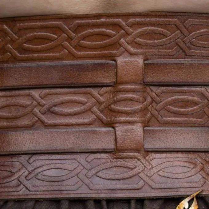 Med denne barbariske kyrads du oprette en vild kriger outfit til LARP eller Cosplay af Germansk, hunnerne, normannere og vikinger. Den kyrads beskytter maven og hofter i løbet larp kampe. Det er lavet af 3 overlappende plader og 1 stort centrale plade. Bagsiden af denne kyrads fastgøres med en smuk bredt læderbælte, dekoreret med knude motiver. Fordi bæltet er så bred, at indkapslede rester fast over dit kostume. Du kan bære det komfortabelt for en hel dag, når man besøger en festival eller LARP begivenhed.