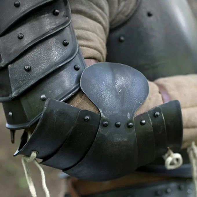 Disse couters er baseret på historiske originaler fra middelalderen. De beskytter både albue og en del af den øvre og nedre arme. Siderne på albuerne er også godt beskyttet. Rustning består af en albue betjent med bevægelige og fleksible overlappende stykker armværn. Den rustning er udstyret med nitter. Du kan vedhæfte den til dine nedre og øvre arme med stærke læderremme. Med snørebånd kan du også binde dem ekstra godt fast til dit Gambeson findes. </ P> Denne rustning er 1 mm tyk og egnet til Larp slag, Cosplay og teater.