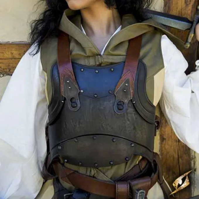 Denne cuirass er meget let og er lavet af læder og stål. Cuirassen beskytter brystet og ribbenene under slag. En stor stålring bagpå forbinder alle stropper, der er fastgjort til brystpladen, og som du kan bruge til at fastgøre den og justere den til størrelse. Dette design sikrer, at brystpladen er behagelig og fleksibel at have på. Brystpladen er let at tage af, fordi de to stropper over skuldrene er fastgjort med stifter foran. Denne rustning ser smuk ud, men er alligevel meget nem at bruge og perfekt til LARP-slag.