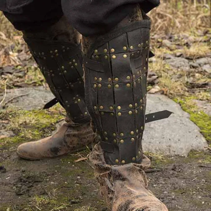 Disse smukke læder grever består af kvadratiske rum i læder, der er forbundet til hinanden med messing søm og giver ekstra beskyttelse til den nedre ben. Læder rustning i denne stil blev brugt i middelalderen og blev hovedsagelig bæres under den sene middelalder ved fodfolk. De kan også bruges til LARP og reenactment af den tidlige middelalder. Du kan fastgøre fedtegrever sikkert til dine underben med læder snørebånd og remme. Disse grever leveres per par.