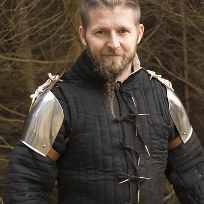 Disse pauldrons foretages efter originaler fra Churburg samling i Sydtyrol. Disse stykker blev foretaget af de bedste smede fra Milano og Innsbruck. Disse skulderstykker kan kombineres med næsten alle plade rustning og gambesons og er særligt egnede til det fjortende århundrede. Den rustning har en skrå bund ved fronten, at aflede slag på armen. Du kan fastgøre rustning til din overarm med en læderrem. Toppen har en læderrem med huller, med de medfølgende snørebånd du kan fastgøre dem til gambesons og plade rustning. </ P> Denne rustning er 1 mm tyk og egnet til Larp slag, Cosplay og teater.