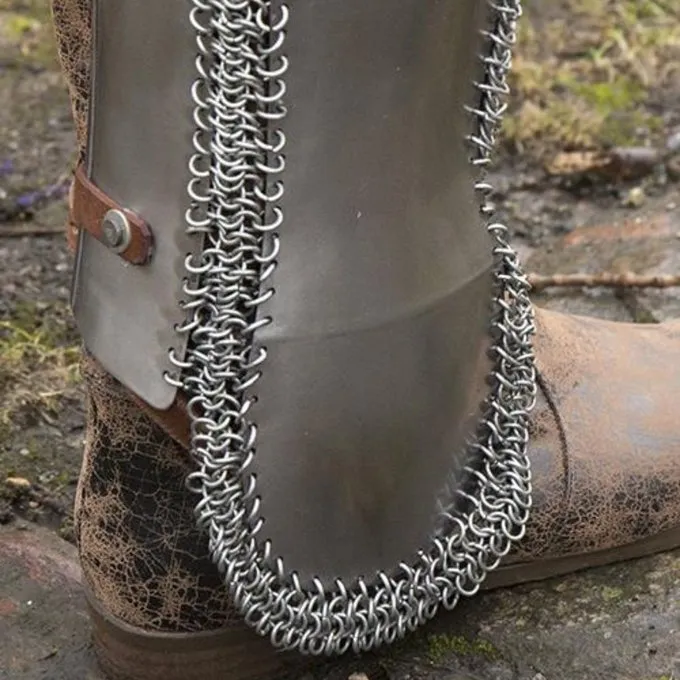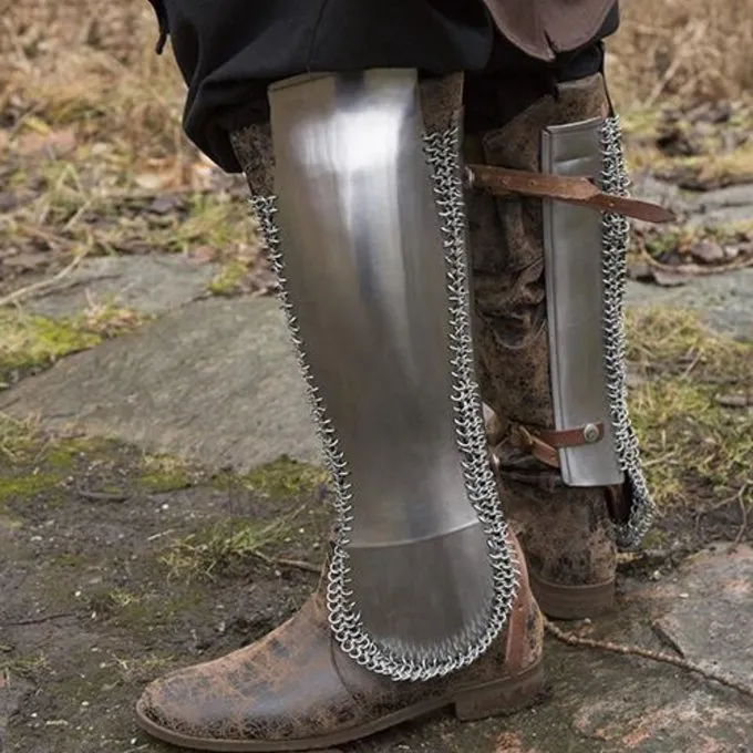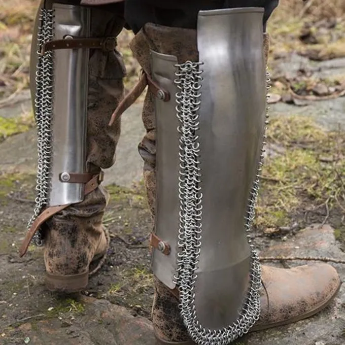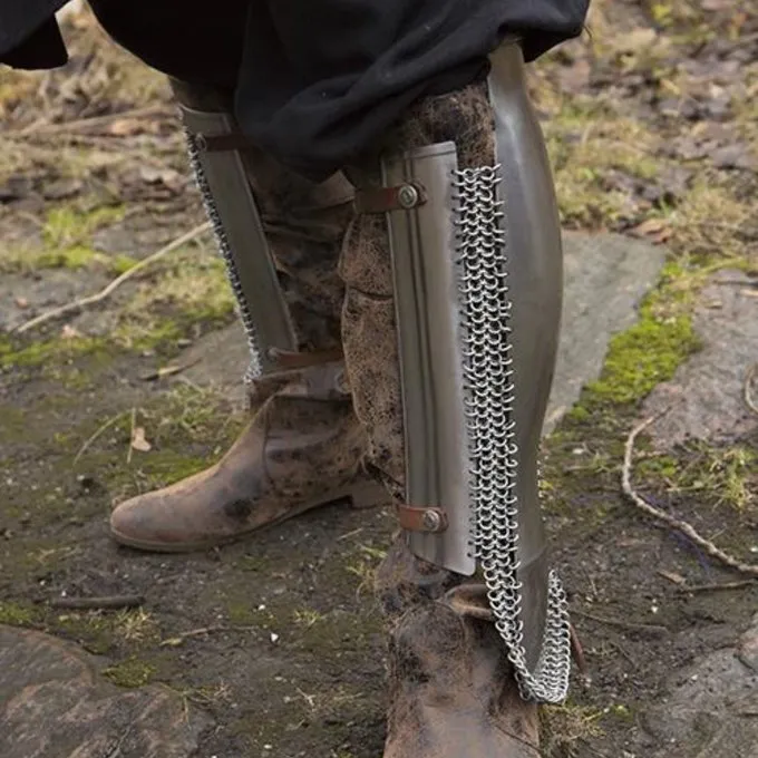 Materiale: blødt stål, galvaniseret stål (ringbrynjer), læder / / Stål tykkelse: 1 mm / / Levering per par / / Finish: poleret / / Længde: 44 cm / / Længde shin: 34 cm / / Bredde: 26 cm / / Chainmail: butted runde ringe, galvaniseret /