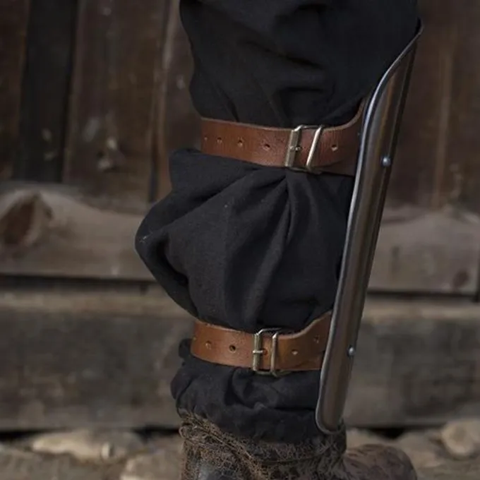 Denne ben rustning er baseret på middelalderlige ben rustning. Det har læderremme til at justere rustning til størrelsen af dit skinneben og sikre det ordentligt. Metallet sværtet på indersiden for at undgå rust. Stålet er 1 mm tyk og beskytter benene godt under larp kampe mod virkningen af pile og lignende.