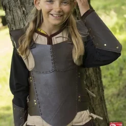 Denne læder rustning til torso er lavet af vegetabilsk garvet læder. Den er velegnet til børn og mindre mennesker med en torso længde på ca.. 48 cm og en brystmål på 66 cm op til 82 cm. Den rustning er pænt prissat og er en god base for en læder LARP tøj af en jæger eller kriger. Den rustning har håndsyet detaljer og læderremme på siden for at tilpasse det til din størrelse.