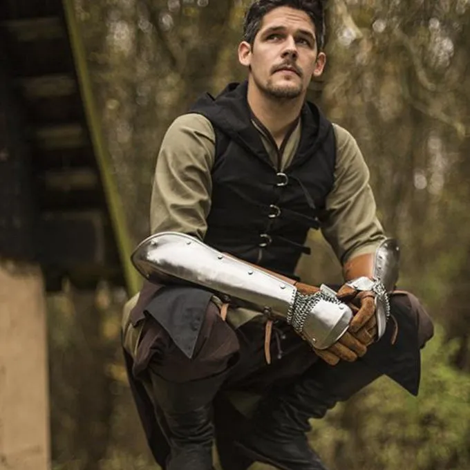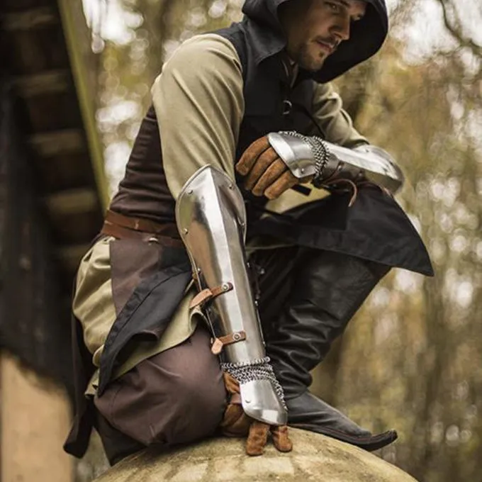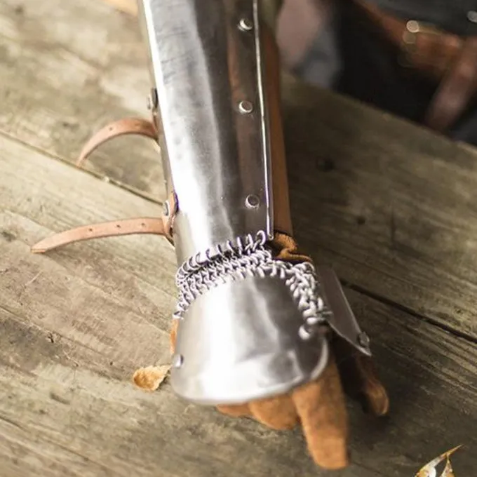 Disse stålvambraces med chainmail er inspireret af middelalderlig rustning. Panseret består af et par vambraces og halve kigger, der er forbundet med et stykke kædepost. Kanten af rustningen er dekoreret med nitter. Armoren er let at fastgøre til armen og hånden med stærke læderremme. Du kan kombinere rustningen med et par gode handsker for ekstra sikkerhed. Denne rustning er 1 mm tyk og passer til Larp-slag, Cosplay og teater.