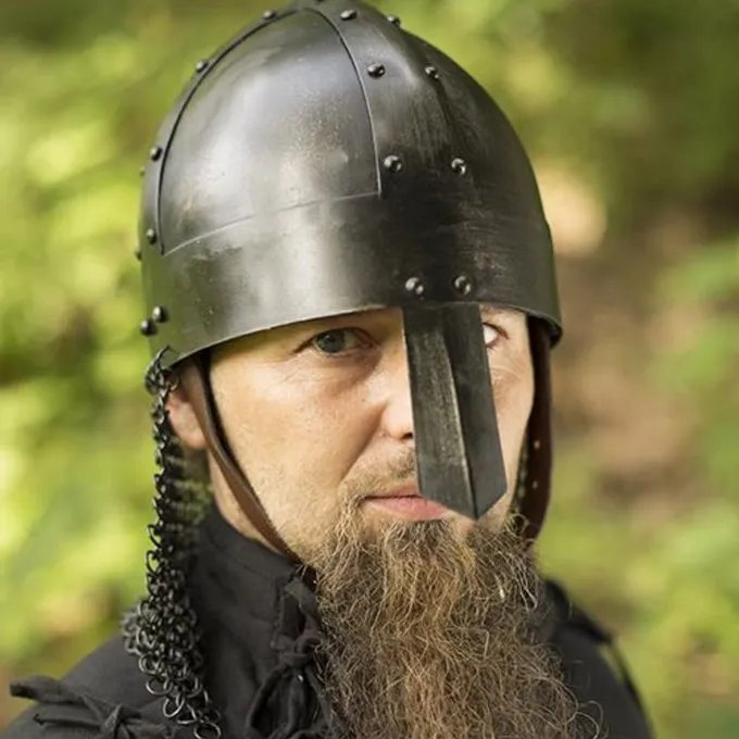 Denne hjelm er lavet af 1 mm tykt stål og er derfor perfekt til LARP, Cosplay eller teater. Lav det ultimative Viking, Germanic eller Norman look! Hjelmen har en bomuldsindsats til ekstra komfort. Du kan fastgøre hjelmen med en læderrem under hagen.