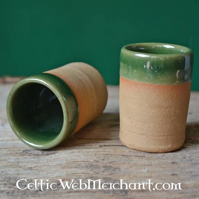 Denne historiske grøn kop lavet af orchery ler er en replika baseret på arkæologiske fund. Det er autentisk håndgjort på drejeskiven. Den Kant er glaseret med en grøn farve og egnet til forbrug og opvaskemaskinen. Den har en diameter på 4 cm og er 5 cm høje.