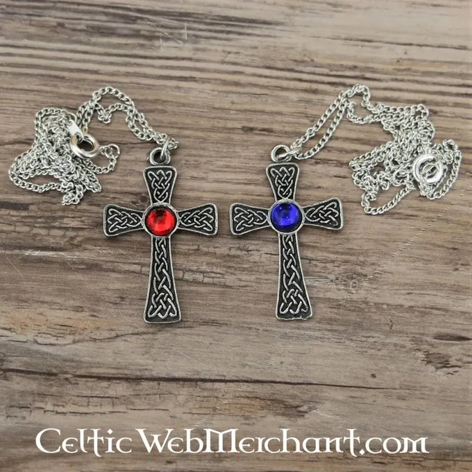 Denne pendant er inspireret af middelalderens keltiske kors. Det er dækket i detailled knotwork og har et blåt glas speeches. Den er lavet af tin og leveres inklusive sølv halskæde.