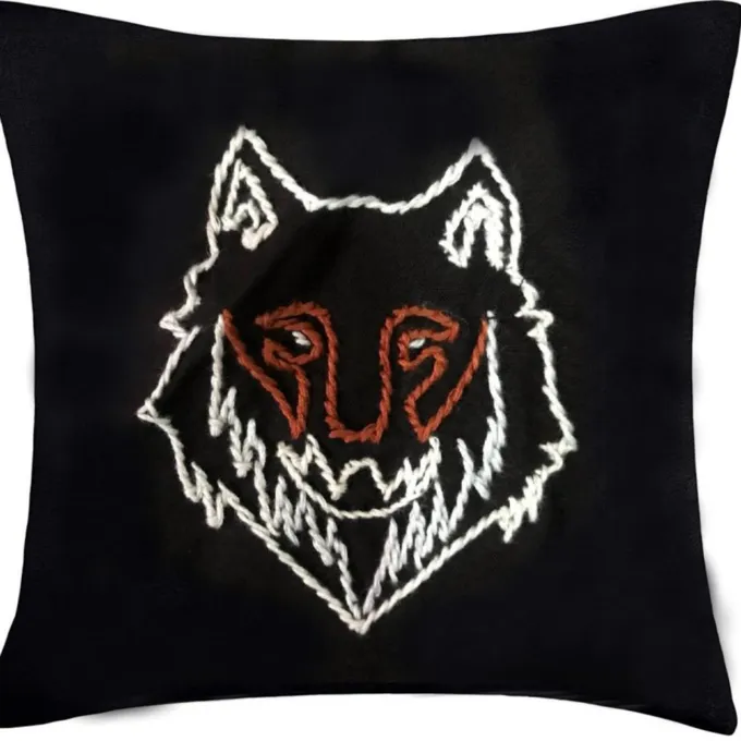 Dette pudebetræk er sort og har en broderet billede af ulven Fenris, i farverne hvid og orange. I den nordiske mytologi, ulven Fenris var en søn af Loke, Viking gud bedrag. Fenris voksede op til at være en snu og meget stærk ulv, en fare for guderne. Det er derfor, de bundet Fenris med gleipner: en fin kæde, hvorfra Fenris ikke kunne bryde løs, indtil Ragnarok. I både Viking og germansk kunst blev ulve afbildet i krig scener, ligesom ravne og ørne. Ulven stod for mord, manddrab, og list. Farlige mænd blev beskrevet som ulve blev bersærkere også forbundet med ulve. Den pudebetræk har en lynlås, så din pude bliver på plads.