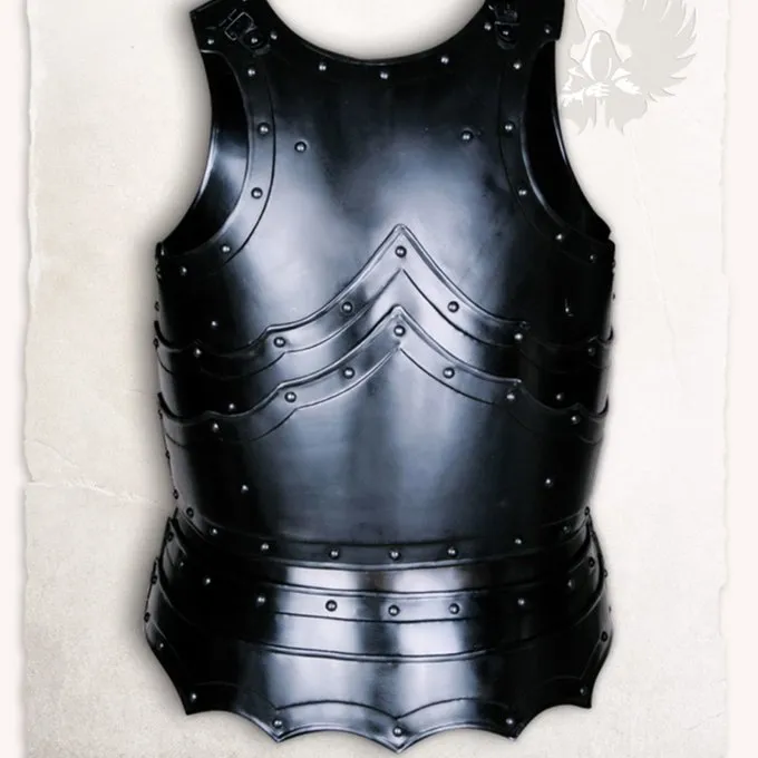 Materiale: kulstofstål / Finish: bronzed / Tykkelse: 1,2 mm / Bryst omkreds ca.. 115-130 cm / Torso længde: 72 cm / Levering inkluderer kyrads og bagplade / Baseret på en historisk original