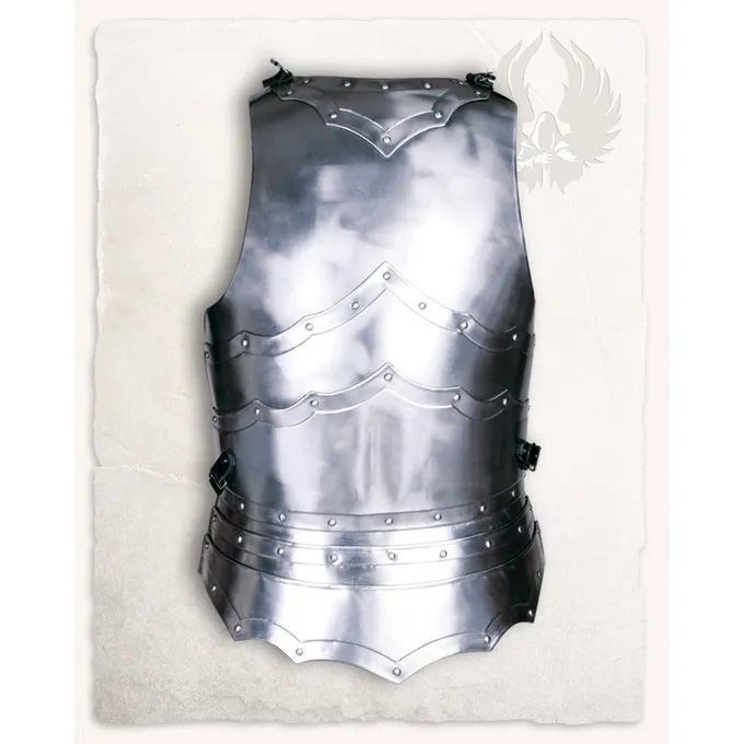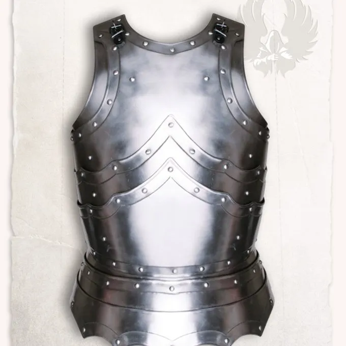 Materiale: kulstofstål / Finish: poleret / Tykkelse: 1,2 mm / Bryst omkreds ca.. 115-130 cm / Torso længde: 72 cm / Levering inkluderer kyrads og bagplade / Baseret på en historisk original