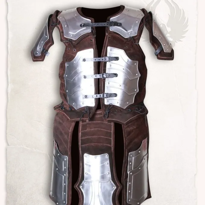 Materiale: kulstofstål, ruskind / Finish: poleret / Tykkelse: 1,2 mm / Farve: brun / Længde: 96-117 cm / Brystomkreds: 104-114 cm / Skulderbredde: 52 cm / Armlængde: 27 cm / Levering: brigandine, vambraces, greve