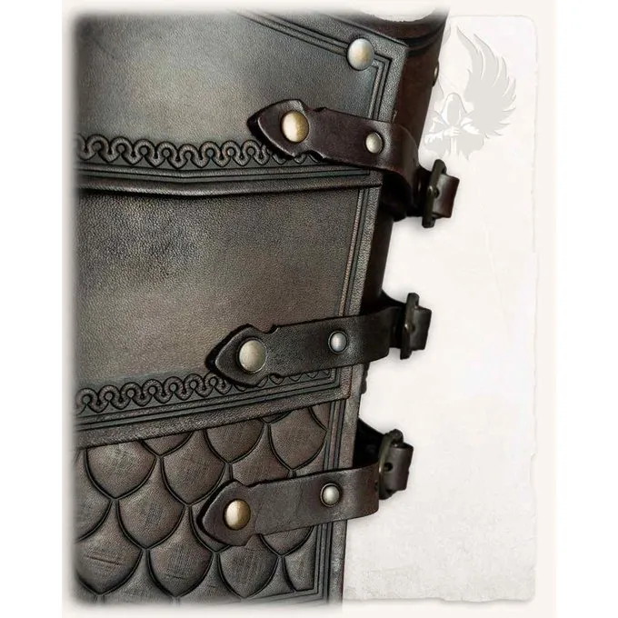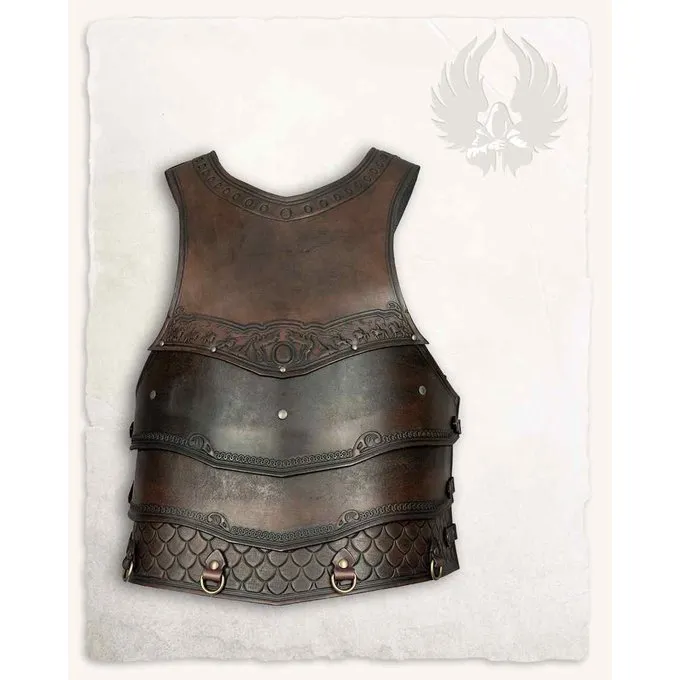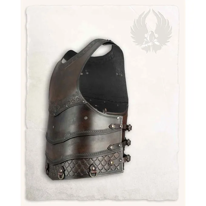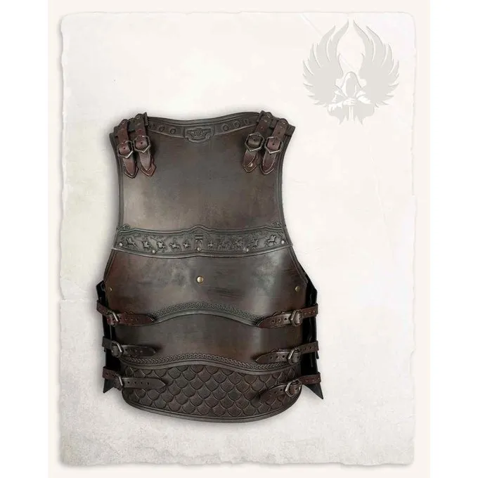 Denne rustning er velegnet til genindførelse, cosplay og larp. Rustningen er lavet af øvre læder. Rustningen kan lukkes med de seks bælte spænder. Dette giver rustningen en perfekt pasform, der giver bæreren en masse bevægelsesfrihed. Denne rustning er meget detaljeret, der er depicioner af riddere og dekorative striber. Dette gjorde det til en rigtig iøjnefaldende!