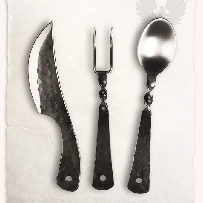Denne traditionelle bestik sæt er hånd-smedet af rustfrit stål. Den gaffel og ske har en dekorativ snoet greb. Dette bestik sæt er ideel til middelalderlige begivenheder, reenactment eller larp lejre.