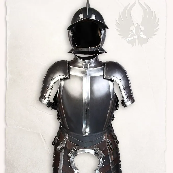 Denne halvleg rustning er lavet efter det 16. 17. århundrede originaler. Ryttere især havde denne type halv rustning. De var bevæbnet med rapiers, sabler, lanser og wheellock pistoler. Armor som dette blev båret under belejringen Malta i 1565, i løbet af de Firsårskrigen og Slaget ved Grolle, i løbet af de Trediveårskrigen og naturligvis i Tudor England. Undertiden denne type rustning blev forsynet med arm og ben rustning og bærerens ombyttet sit burgunderhjelm for en armet. På denne måde kan du tilpasse rustning for stærkt pansrede chok tropper. Denne halvleg rustning består af Pauldrons, Gorget, tassets og burgunderhjelm. Denne sele kan godt tilpasses størrelse.