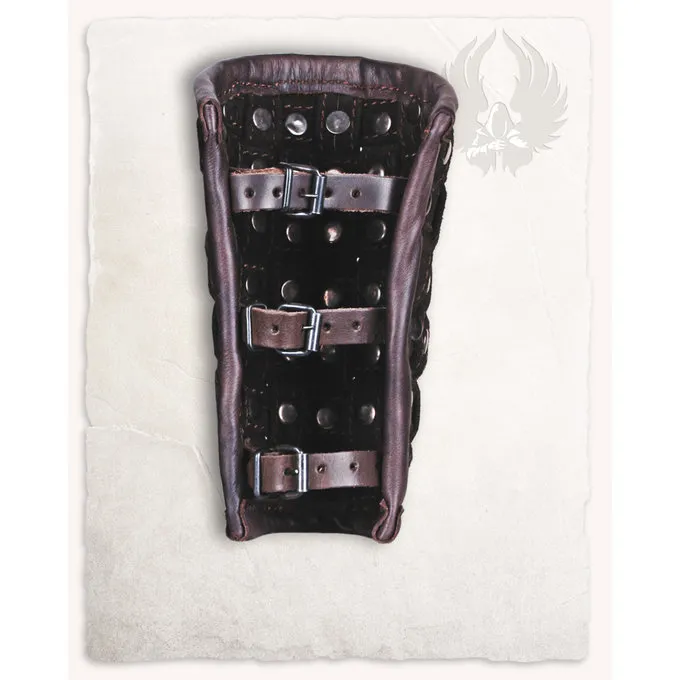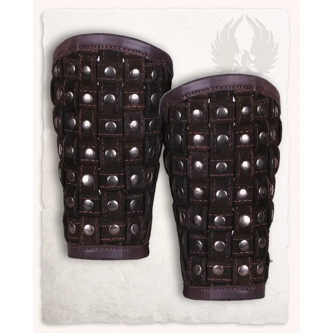 Disse Vambraces er egnede til reenactment, cosplay og larp. Vambraces er lavet af suede læder, hvilket gør dem ekstra behagelige. Vambraces består af flettet læderremme, som er nittet sammen. De kan lukkes med to bælte spænder.