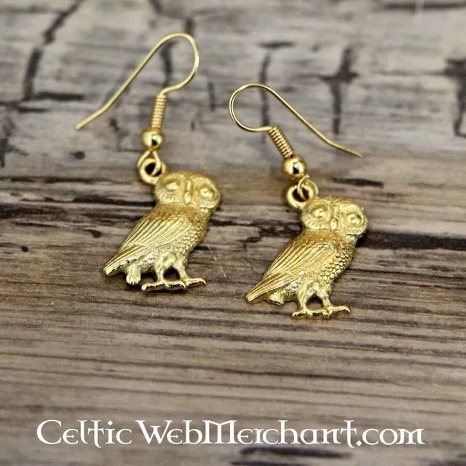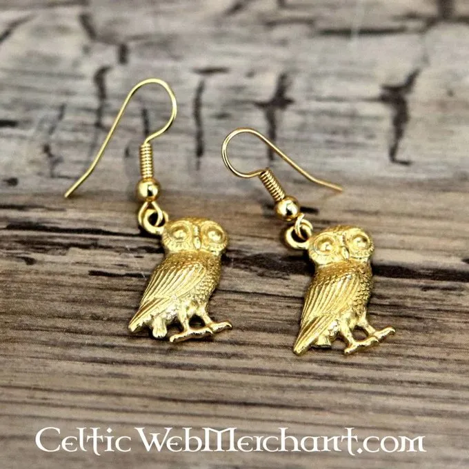 Uglen var symbolet på Minerva, den romerske gudinde for visdom. Disse smigrende øreringe er lavet af guldbelagt tin og har guldbelagte, allergivenlige øre ledninger.