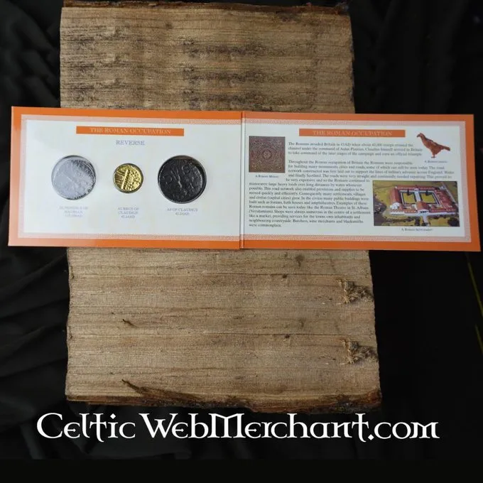 Disse tre mønter leveres inklusive et kort. Kortet indeholder oplysninger om den romerske besættelse af Britannia
