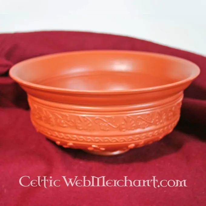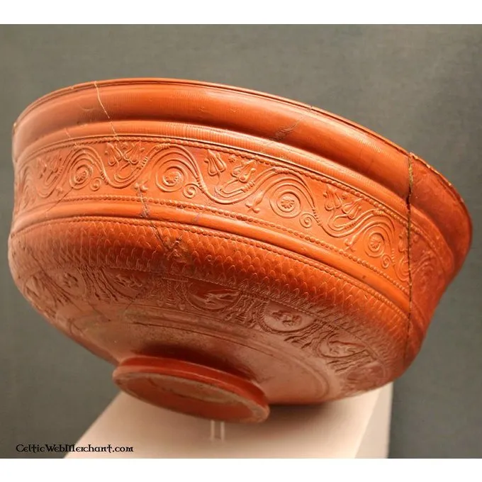 Denne skål er en kopi af forskellige dele, der findes i hele Romerriget. Skåle som denne blev almindeligt anvendt i løbet af 1. til 4. århundrede e.Kr.. De blev foretaget i det sydlige Gallien ved keramikværksteder (officinae); under produktionen blev anvendt en slags masseproduktion.