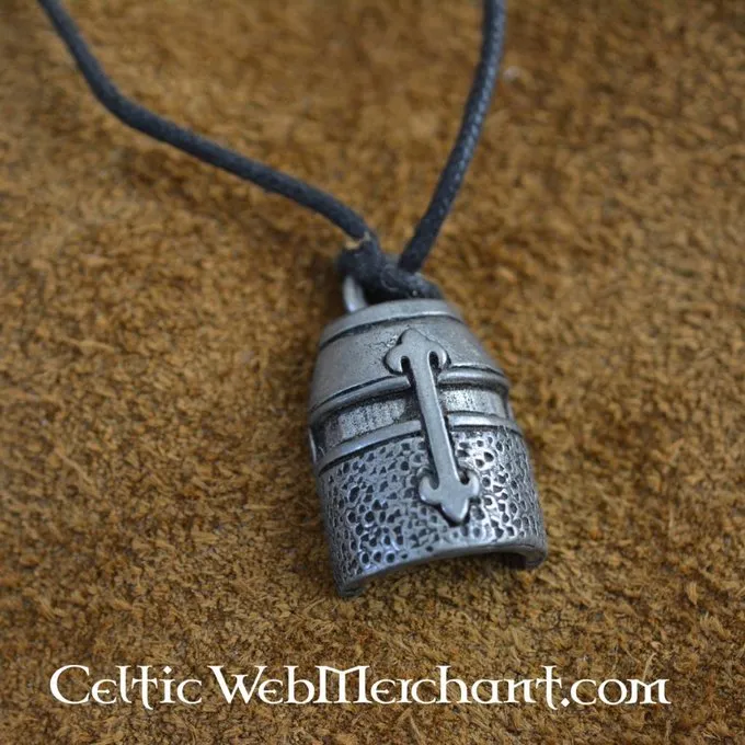 En sølv vedhæng af en middelalderlig Tempelridder hjelm. Hjelme som denne blev båret af den Tempelriddere i Det Hellige Land. Denne tøndehjelm symboliserer ridderskab og beskytte de svagere mennesker i samfundet. Dette vedhæng er lavet af sterlingsølv og measires 1,5 x 2,5 cm
