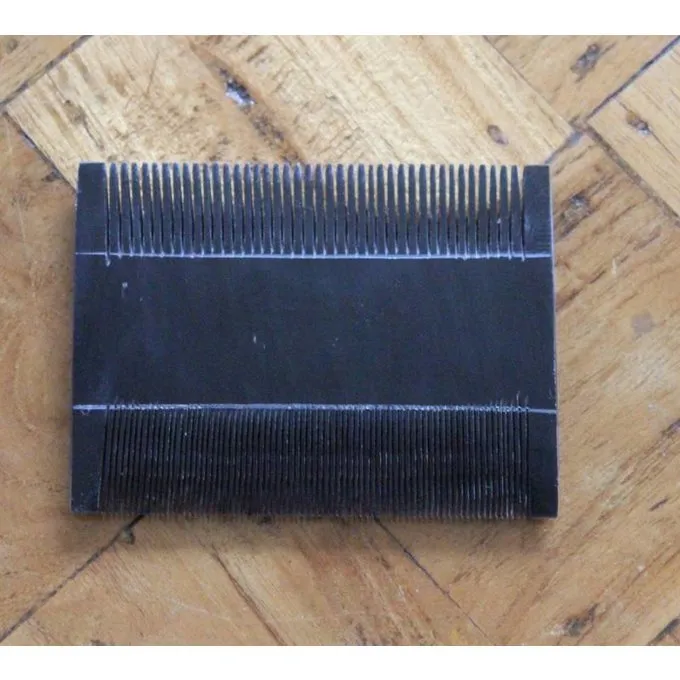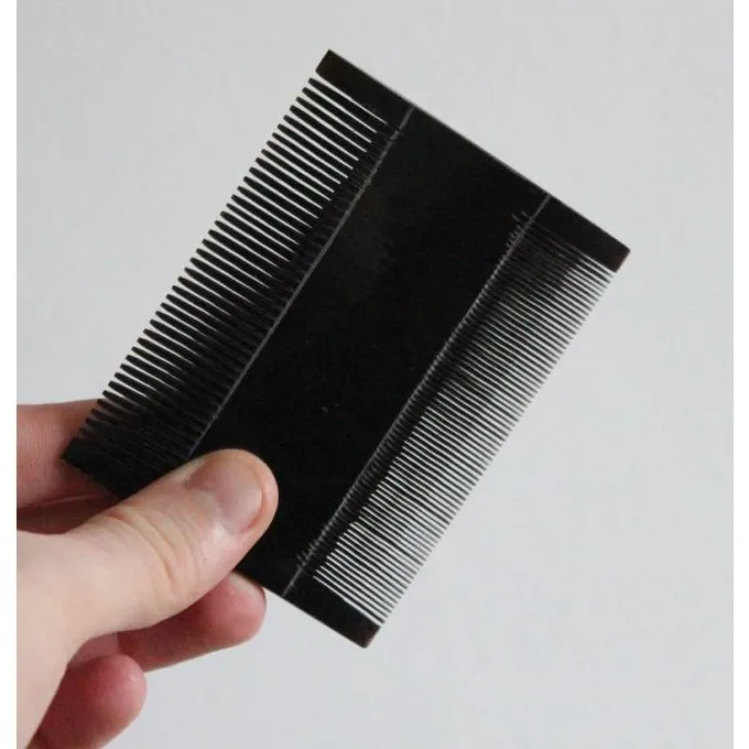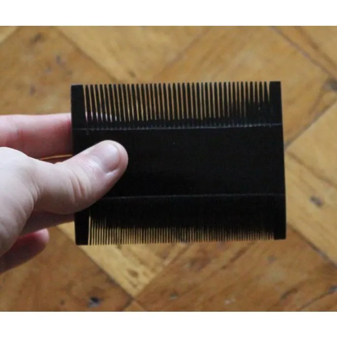 Dette dobbeltsidet kam er fremstillet af mørk ko horn. Den måler 7 x 9 cm.