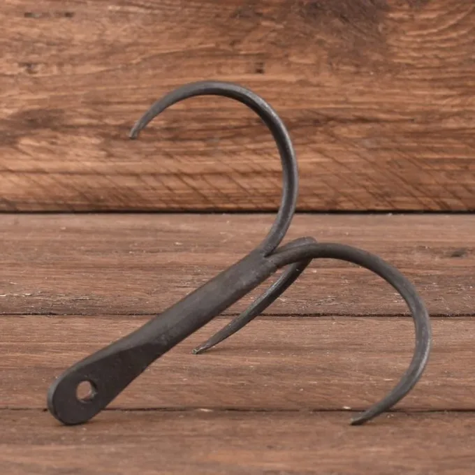 Til rygning bacon, laks og andre lækre ting! Denne rygkroge er en kopi af en romersk original udgravet i Rhinen-området. I dag er det en del af samlingen af Landesmuseum i Bonn. Røg kroge som dette er blevet fundet i London og Velzen. De blev brugt fra den klassiske periode til det 18. århundrede. Denne jernkrog er let at fastgøre på et reb eller køkkengrej.