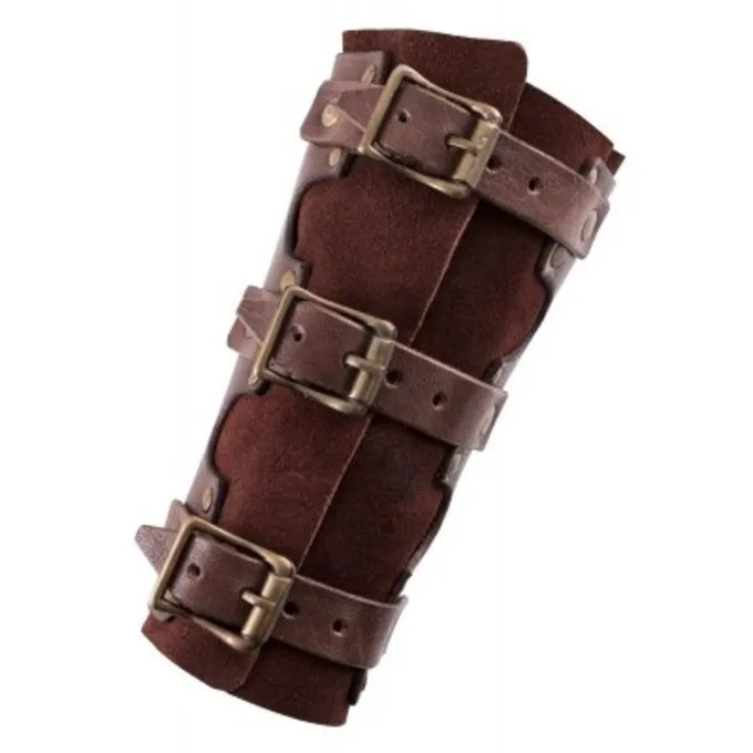 Dette par armbeskyttere i plade er lavet af stærk vegetabilsk garvet læder og blødt ruskind. Rustikke nitter forbinde de to lag af læder. Overfladen og kanter tykt læder er poleret og har en lys farve finish, som giver læderet sin karakteristiske vintage look. De armbeskyttere i plade kan lukkes med tre spænder og kan justeres i størrelse.