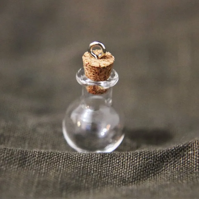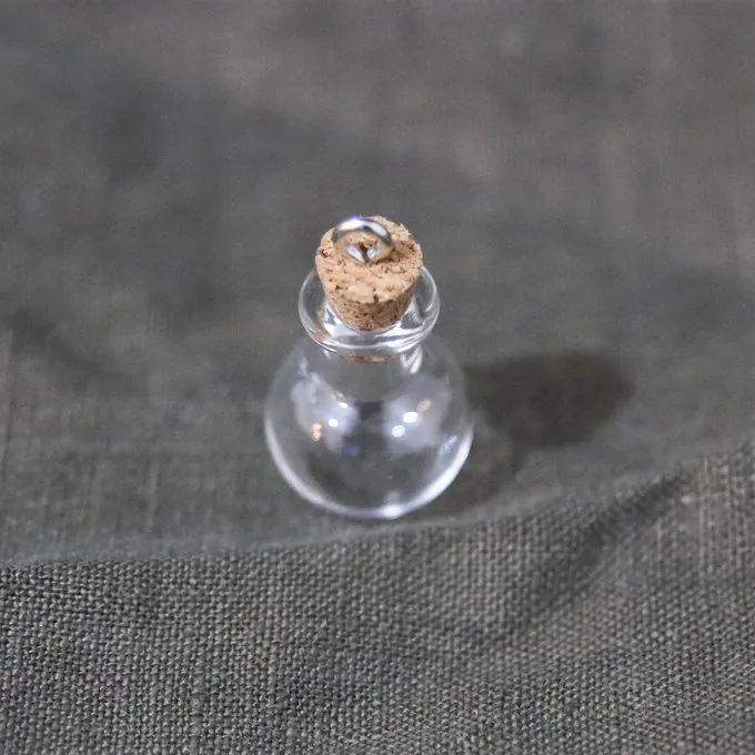 Proppen af denne flaske har et øje, så du kan bære den på en halskæde rundt om halsen. Du kan fylde flasken med forskellige farvede væsker, sten, mineraler, sand, pergament og alle former for andre stoffer. Du kan også dekorere ydersiden for ekstra effekt. Et særligt tilbehør til festivaler, LARP, nyopførelse og brug hver dag.